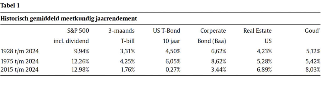 1 Omdat goud wordt uitgedrukt in US-dollars is voor de vergelijking ook gekozen voor beleggingscategorieën in US-dollars. Verder is geen rekening gehouden met beleggingskosten en belastingen die van invloed zijn op het rendement en het kapitaal. De gehanteerde cijfers in tabel 1 en 2 zijn opgesteld door de Indiaas-Amerikaanse academicus Aswath Damodaran. Hij is een academicus die momenteel de Kerschner Family Chair in Finance Education bekleedt en ook hoogleraar Financiën is aan de Stern School of Business van New York University