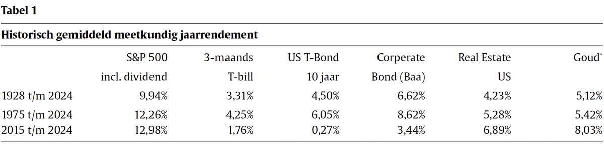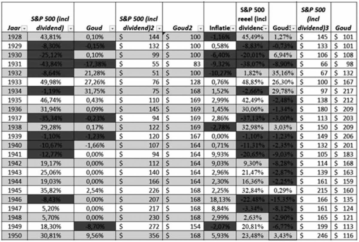 In tabel 2 is de kracht van het ‘rente-op-rente’-effect duidelijk zichtbaar uitgaande van een eenmalige investering van 100 Amerikaanse dollar in de S&P 500 en goud. Historisch gezien is het rendement op de S&P 500 – waarbij de dividenden worden herbelegd – op de lange termijn superieur aan dat van goud. Echter, dit is niet altijd het geval. Er zijn ook tijdvakken te benoemen waarin goud beter heeft gepresteerd dan de S&P 500. Duidelijk wordt verder dat een verschil van enkele procenten in rendement op de langere termijn een enorm verschil uitmaakt voor het uiteindelijke kapitaal. Ook wordt duidelijk uit tabel 2 de (negatieve) impact van inflatie op het belegde kapitaal; deze beïnvloedt de koopkracht aanzienlijk. Op basis van het verleden kan gesteld worden dat in de regel aandelen een betere bescherming bieden tegen inflatie dan goud, maar dat er zeker ook perioden zijn waar goud een betere bescherming biedt. In de afgelopen bijna 100 jaar schommelde het rendement van aandelen nominaal tussen de +52% (1954) en -44% (1931) en het rendement van goud tussen de +126% (1979) en -33% (1981). Hieruit kan worden afgeleid dat niet alleen aandelenkoersen, maar ook de goudprijs fors in waarde kan schommelen.