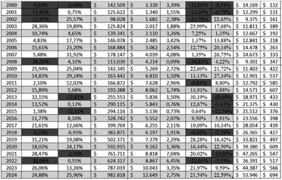 Uit tabel 1 kan worden afgeleid dat de S&P 500 over de tijd vakken 1928-2024, 1975-2024 en 2015-2024 gemeten een beter rendement laat zien dan goud. Maar er zijn ook tijd vakken waarin goud beter rendeerde dan de aandelen binnen de S&P 500, bijvoorbeeld in de jaren dertig en zeventig van de vorige eeuw. Maar ook over de afgelopen 25 jaar kunnen we concluderen dat goud een beter rendement heeft laten zien en dit tegen een lager risico. Hier staat weer tegenover dat in de periode 2015-2024 de S&P 500-aandelen gemiddeld een beter rendement behaalden dan goud. Uit tabel 2 op p. 26 kunnen we afleiden dat goud van de 96 onderzochte jaren, 39 jaren (40%) een beter rendement behaalde dan de S&P 500. In 44 van de 96 jaren (46%) zien we het effect dat wanneer de ene belegging (aandelen of goud) in waarde stijgt, de andere belegging juist daalt.1