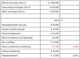 Stel dat een vastgoedbelegger drie panden heeft met elk een WOZ-waarde van ongeveer € 333.000. Elk van de woningen is gefinancierd met een aflossingsvrije lening van € 150.000, rente 5%, looptijd twintig jaar. Op dit moment ontvangt hij een huur van € 1500 per woning. Op basis van de nieuwe regels mag deze vastgoedbelegger vanaf 2024 naar verwachting maximaal € 1000 per maand rekenen per woning.8 Rekening houdend met minimaal 1% kosten en lasten en de te betalen financieringsrente resteert in dit voorbeeld nog een direct rendement van € 3500 per jaar. Hier moet de box 3-belasting nog vanaf. Door de toepassing van de leegwaarderatio valt de te belasten WOZ-waarde iets lager uit. Deze komt in dit voorbeeld neer op 90%.9 Ervan uitgaande dat deze vastgoedbelegger een fiscale partner heeft en verder geen overige bezittingen en schulden in box 3, bedraagt de belasting € 10.600 (beschikt hij niet over een fiscale partner dan is de heffing € 12.300). Onder aan de streep resteert een negatief (direct) rendement van € 7.100. Afgezet tegen het netto-vermogen van € 550.000 is dit een negatief rendement van minus 1,09%.