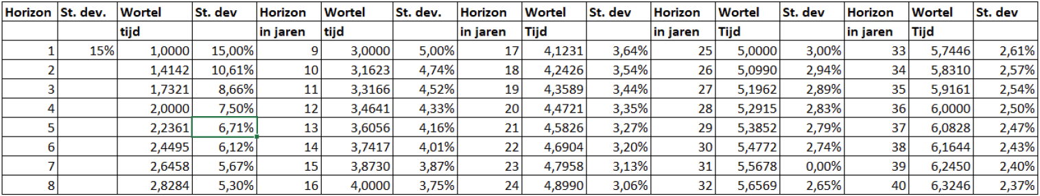 de volgende periode niet gerelateerd zijn (geen mean reversion). Al met al daalt de standaarddeviatie van de beleggingsportefeuille volgens deze theorie jaarlijks. Stel dat een aandelenfonds een eenjarige standaarddeviatie heeft van 15 procent, dan zal de verwachte standaarddeviatie in vier jaar tijd gedaald zijn naar 7,5 procent op basis van de formule 15 procent/ vierkantswortel 4. In acht jaar tijd is de standaarddeviatie verder gedaald naar 5,32 procent (15 procent/ vierkantswortel 8). Op basis van deze formule zien we dat het verwachte risico – uitgedrukt in standaarddeviatie – daalt naarmate de beleggingshorizon toeneemt. Echter, de mate waarin het risico daalt neemt elk jaar af naarmate de horizon toeneemt (zie figuur 2).