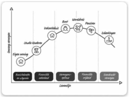In figuur 10 is een voorbeeld van een levenslijn weergegeven gebaseerd op eerder in dit artikel besproken Goals – Based Investing Pyramid. De verschillende levensfases zijn ook zichtbaar. Tot de pensioendatum bouwen klanten vermogen op en verwezenlijken zij bepaalde doelen, zoals het kopen van een vakantiehuis. Vanaf de pensioendatum neemt het vermogen af, omdat dit nodig is om het pensioeninkomen aan te vullen. Ook wordt het ‘overtollige’ vermogen bij voorkeur alvast bij leven overgedragen aan de kinderen.