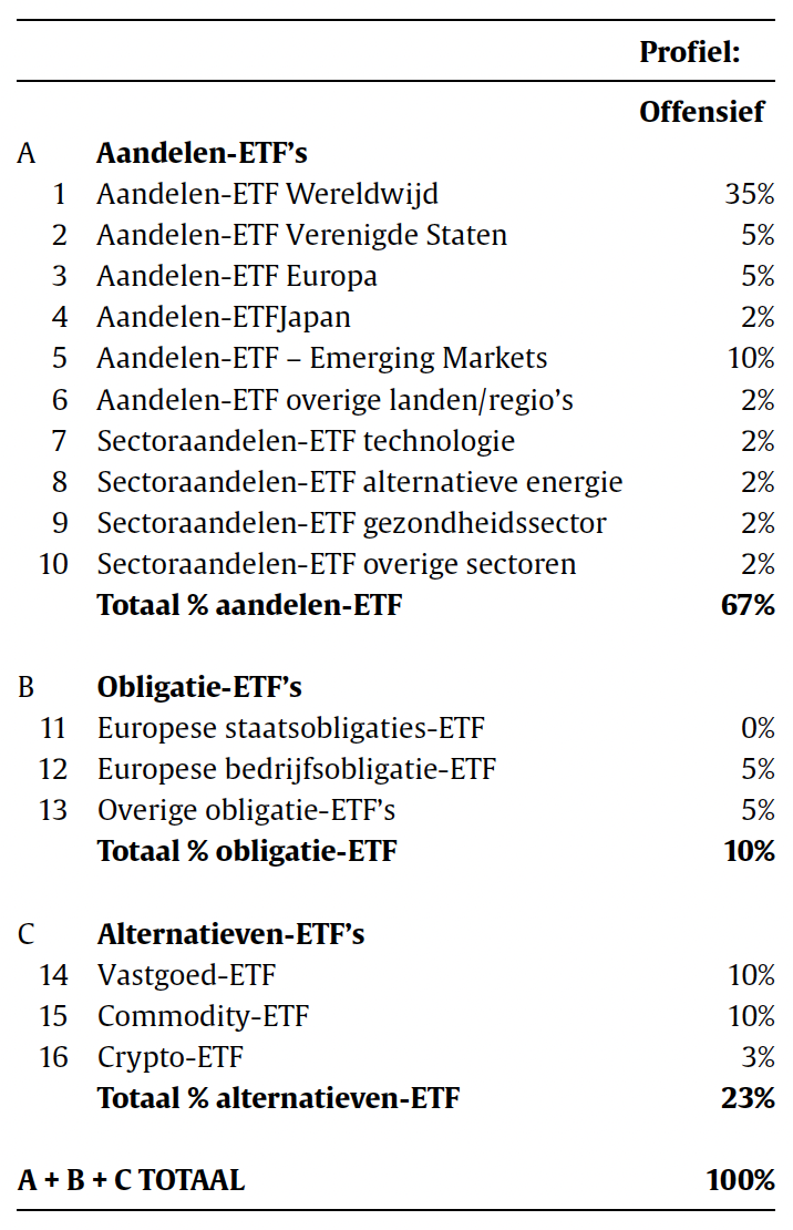 Als het doel en bijbehorend kapitaal bekend zijn, kan gestart worden met het vormgeven van de ETF-portefeuille. Hier speelt de financieel planner of adviseur een belangrijke rol. De vertaalslag van de (financiële) wensen en doelen naar de daadwerkelijke invulling gebeurt via de asset allocatie. Welke asset allocatie leidt tot de beste haalbaarheid van het doel? In tabel 1 een voorbeeld van een asset allocatie: