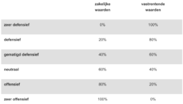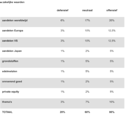 Het bepalen van de ‘beleggingsmix’ — ook wel ‘asset allocatie’ genoemd — is de belangrijkste beleggingsbeslissing die u neemt. De verhouding tussen de beleggingselementen bepaalt namelijk voor het overgrote deel het rendement en het risico van uw beleggingsportefeuille en moet dus aansluiten bij uw risicoprofiel. Dat risicoprofiel laat zien hoeveel risico u met uw beleggingen kunt en wilt lopen en wordt veelal vastgesteld met behulp van een vragenlijst. De uitkomst van de vragenlijst en het door u behaalde puntentotaal leidt tot het uiteindelijke beleggingsprofiel. De uitkomst zal zijn: zeer defensief, defensief, neutraal, offensief of zeer offensief. Hoe offensiever het profiel, hoe hoger het risico en dus het verwachte rendement.